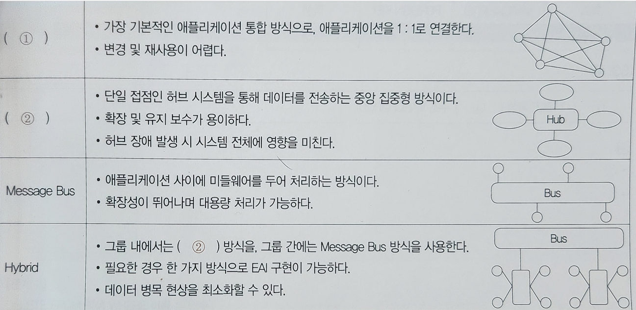 다음은 EAI(Enterprise Application Integration)의 구축 유형에 대한 설명이다. 괄호(①,②)안에 각각 들어갈 알맞은 유형을 쓰시오.