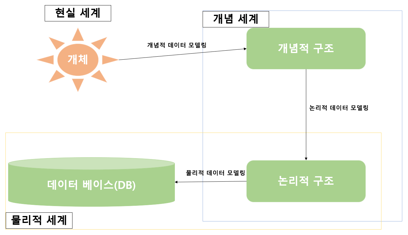 ▪ 개념적 데이터 모델링(추상적↑ 구체적↓) → 논리적 데이터 모델링 → 물리적 데이터 모델링(구체적↑ 추상적↓)