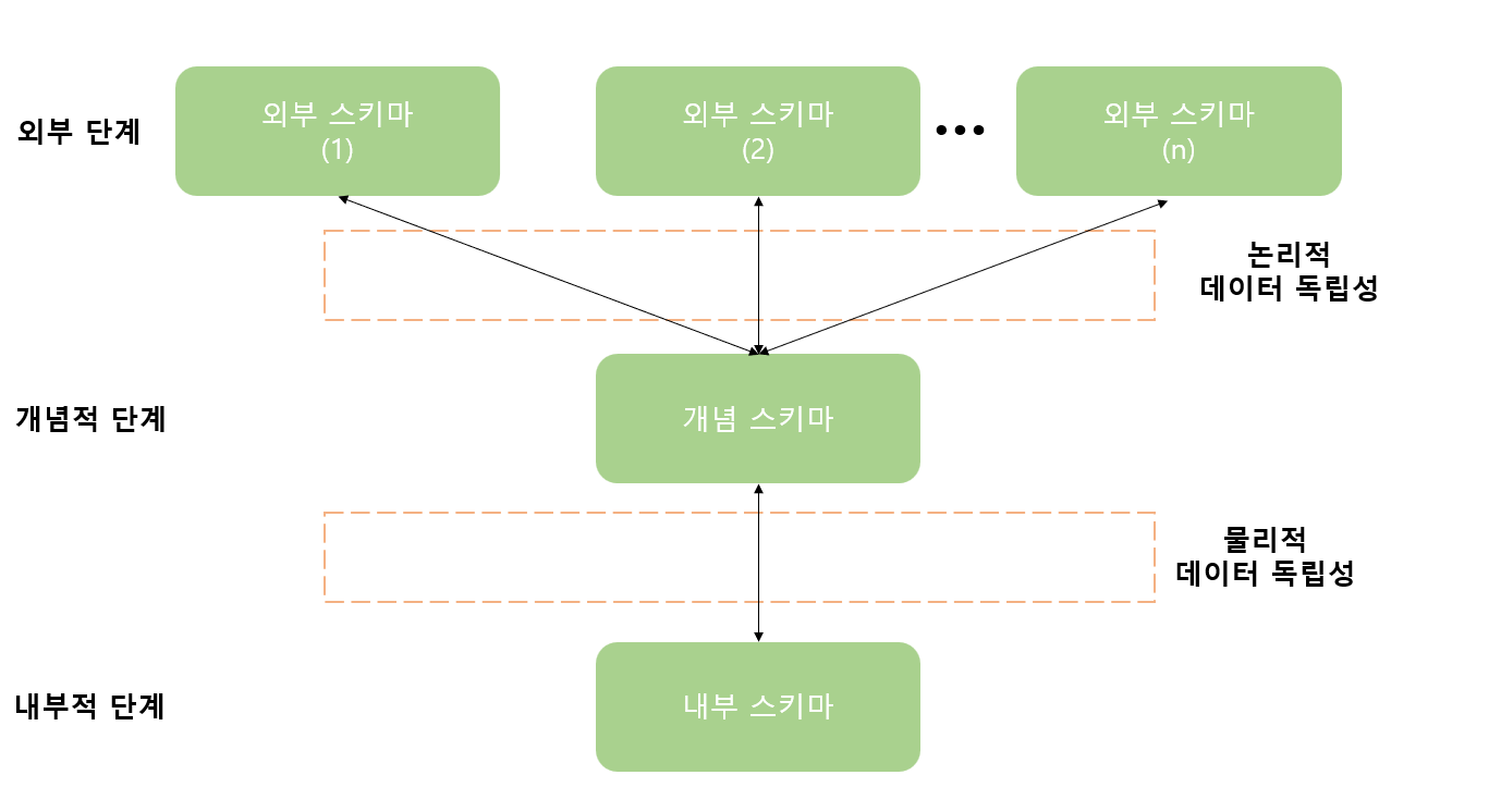 ▪ 물리적 독립성(개념 - 내부) 내부 스키마 변경 → 외부/개념 스키마 영향X