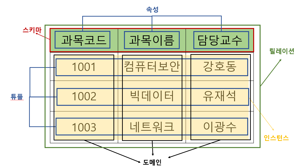 + 속성 : 데이터 모델링 관점에서의 속성은 "업무에서 필요로 하는 인스턴스에서 관리하고 자하는 의미상 더 이상 분리되지 않는 최소의 데이터 단위"를 의미한다.